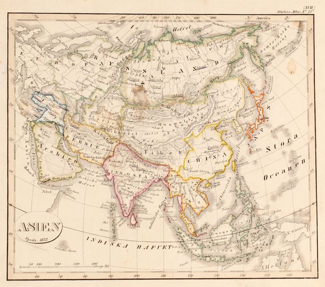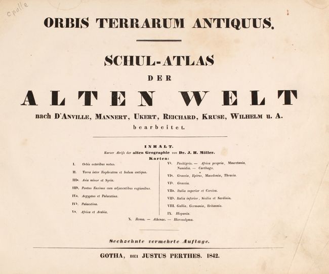 These two complete school atlases are bound into one volume. Schul-Atlas uber alle Theile der Erde, was published in 1845, and is based on Stieler's Hand-Atlas. It contains 27 single-page maps, including two of the stars and planets, two of the world, fourteen of Europe and Russia, four of Asia, one of Africa, and four of the Americas. Both the North America and United States maps show Mexico encompassing the majority of the Southwest and California, Texas as an independent Republic, and the Oregon Boundary dispute. The United States map also outlines the states and districts, with most of the land west of the Mississippi identified as Indian Territories. The other atlas in the volume, Orbis Terrarum Antiquus, published in 1842, contains 15 single-page maps of the Ancient World based on maps by D'Anville, Mannert, Ukert, Reichard, Kruse, Wilhelm and others. It also includes 14 pages of text (4 of which are bound out of order) containing a brief synopsis of ancient geography. Oblong Quarto, bound in quarter calf with thick mottled paper boards.