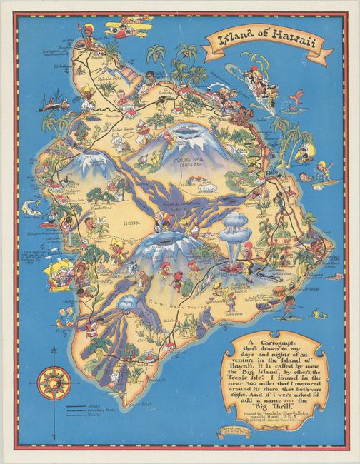 These very colorful and decorative maps showing the four main islands of Hawaii are drawn in a whimsical, humorous style much like Jo Mora's celebrated work of the same period. Cartoonish characters populate each with major roads and points of interest noted, which actually make them fairly useful maps for the tourist. Each has a ribbon title banner and a descriptive cartouche. Issued by the Hawaii Tourist Bureau. Blank versos. Size varies slightly.