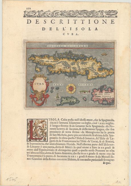 This captivating map of the island is based on the cartography of Giacomo Gastaldi. The map includes Jamaica and part of Hispaniola. The Ye de Lagartos, shown north of Jamaica, is one of the earliest references to the Cayman Islands to appear on a map. The map was graphically engraved by Girolamo Porro, with a stipple engraved sea embellished with sea monsters, a sea turtle, a compass rose, and a decorative title cartouche. It is from one of the most famous Isolarios (Island Books) produced in the 16th century. Printed on a full sheet (8 x 11.4") of Italian text with a historiated initial; title above map, Descrittione Dell' Isola Cuba.