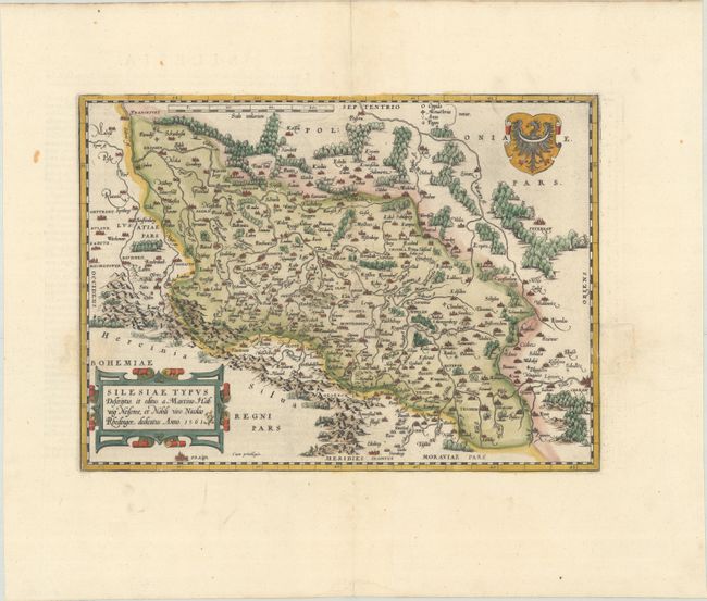 A nice example of Ortelius' first map of Silesia. It is based on a map by the Silesien cartographer Martin Helweg in 1561, and is beautifully engraved with large forests, mountain ranges, and a strapwork title cartouche and coat of arms. Wroclaw (Breslaw) is located near the center of the map and Krakow is at bottom right. Latin text on verso.