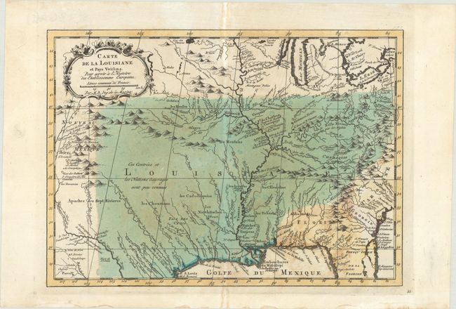 Superb small map based on Delisle's map of the French colony of Louisiana. This finely engraved and detailed map of French Louisiana extends from the Great Lakes to the Gulf of Mexico and from Nouveau Mexique to Florida (not showing the tip of Florida). Many Indian place names, forts, and early European settlements are shown. Nouveau Mexique in the far west includes Santa Fe and names the S. Jerome de Taos. The decorative title cartouche includes the distance scale.