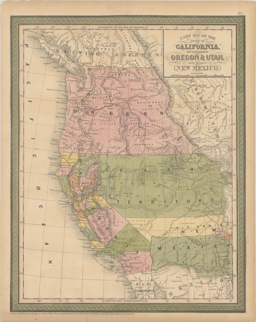 This version was re-engraved on the same plate as the previous edition, with a new title and several notable updates. This is the first edition of this title showing counties in California and New Mexico. Oregon Territory takes in all of present-day Washington and Idaho with the eastern boundary abutting Missouri Territory. Lewis & Clark’s route and the Oregon Trail are shown. The huge and newly formed Utah Territory covers the region labeled Fremont Basin and stretches from the California border to just past the Rocky Mountains. The Owens Valley, Humboldt, and Nicollet lakes are present, and Fremont’s route from Walker Lake to Salt Lake is shown. The tributaries of the upper Colorado River are updated, adding the White River, Red River, etc. New Mexico Territory (also formed in 1850) encompasses parts of present-day Colorado and Arizona with its southern boundary on the Gila River in a pre-Gadsden Purchase configuration. The Gila River is shown correctly with its terminus in the Colorado River. Published in 1852.