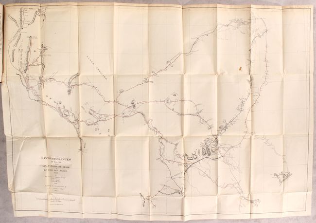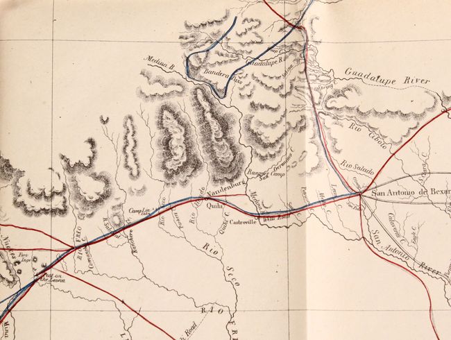 A. Reconnaissances of Routes from San Antonio de Bexar to El Paso del Norte &c. &c. (36.3 x 24.6"). This map covers the region of Texas between the Rio Grande at left and east to include Matagorda Bay, Preston and Fort Washita. There is good detail along routes, especially around San Antonio de Bexar, and mostly blank elsewhere. Shows a reconnaissance of 1849 in red and Lt. Whiting's route in blue. It is filled with geographical information, forts, presidios, springs, fords, watering holes and much more. Mostly uncolored save for fine coloring along the routes.