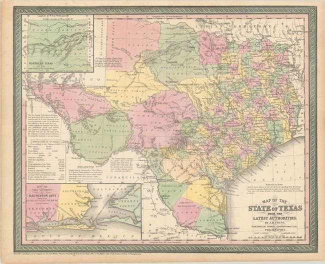 This handsome map of the young state of Texas is one of the most influential atlas maps of the period. The map depicts the new boundaries that were determined by the Compromise of 1850. The organized counties extend only to Cooke in the north and Kinney in the southwest. The western edge of the frontier is marked with a line of army forts separating the settled region from the vast area noted as rolling table lands and desolate plains, Destitute of Timber, that is largely the range of Apache, Kiowa, Comanche, and Lipan Indians. Wagon roads, springs, and trails are identified, including the Apache Trail, Comanche War Trail, Connelly's Trail, and the Emigrant's Route. A dotted line shows the proposed railroad route to the Pacific. Important battlefields in both the Texas war for independence and the Mexican-American War are located. Interesting notations include Grand Indian Crossing, Large Droves of Wild Horses and Cattle, Howard's Spring, Pecos Ferry (on the Pecos River), Horsehead Crossing, etc. Descriptive explanations and notes make this map an interesting study. A table provides statistics according to the Census of 1850 including the population by ethnic groups, e.g. "Free Colored males" is given as 171. There are insets of Northern Texas, noting the northern boundary at Lat. 36° 30', as resolved in the Compromise of 1850, and the vicinity of Galveston City. Dated 1850, but published 1853-54. Engraved by J.L. Hazzard.