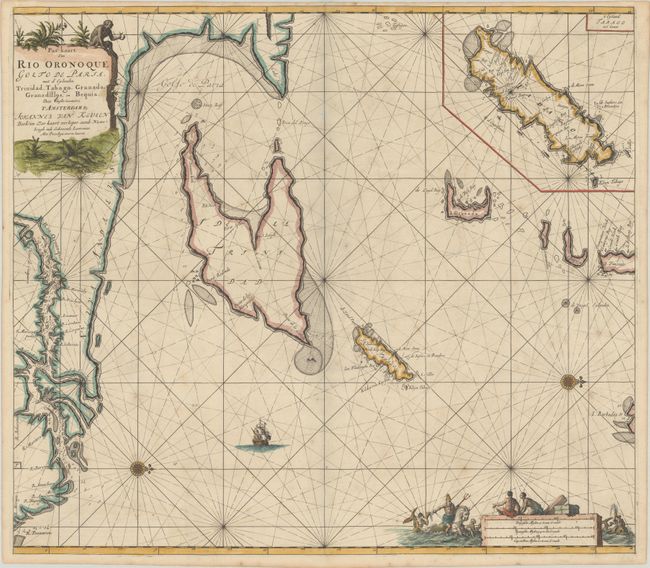 This handsome chart of the Gulf of Paria delineates the entrance to the Orinoco River and highlights the islands of Trinidad and Tobago. The chart is oriented with north to the right by two compass roses and extends to include St. Vincent and the southern tip of Barbados. An inset at top right shows Tobago on a larger scale. The delightful scale cartouche features Neptune with his entourage and natives with trade goods. The map is further adorned with a monkey atop the title cartouche and a sailing ship.