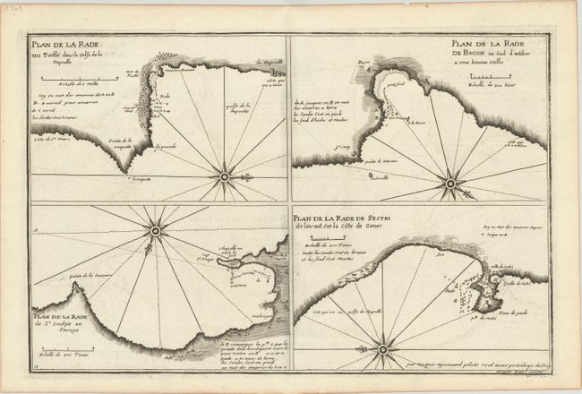 These two sheets contain 5 charts covering portions of the Mediterranean coastline from approximately Marseilles to just east of Genoa, Italy. The charts indicate depth soundings, anchorages, notations, and coastal features. Each is decorated by a 16-point compass rose with fleur-de-lis. Created by Jacques Ayrouard and engraved by Louis Corne. Surprising little is known about Jacques Ayrouard and he only published this single book on the ports in the Mediterranean. He was a navigator for the French Royal Navy and dedicated his work to Jean Frederick Phelypeaux Comte de Maurepas, who was the Minister of the Navy to Louis XV.