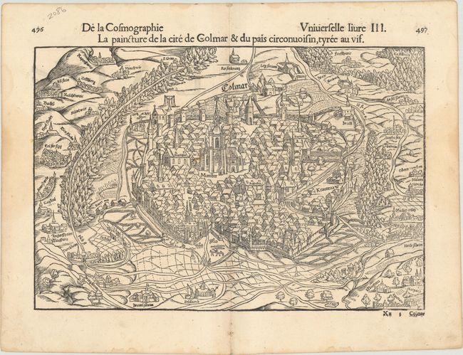 Attractive bird's-eye plan of the Alsatian city of Colmar. This scene exemplifies the bold style of woodblock engraving with the huge cathedral and other church steeples dominating the city center, and forests, lush farmland and tiny villages filling the surrounding countryside. French text on verso.