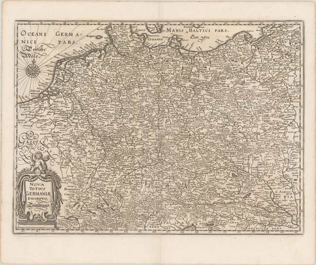 This map of the German Empire covers present-day Germany, Poland, Netherlands, Belgium, Switzerland, Austria, Czech Republic, and parts of Poland and Hungary. The map is densely engraved with information on political boundaries, towns, rivers, and topography. The decorative cartouche features a cherub, grapes, and other fruits.