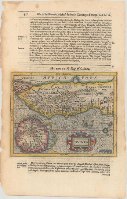 A beautiful small map of the west coast of Africa covering the coast from Sierra Leone to Gabon with a large decorative inset of I. S. Thomae. Further embellished with a sea monster and strapwork title cartouche. This edition is on a full page (8.6" x 13.5") with English text above and below the map as well as on verso.