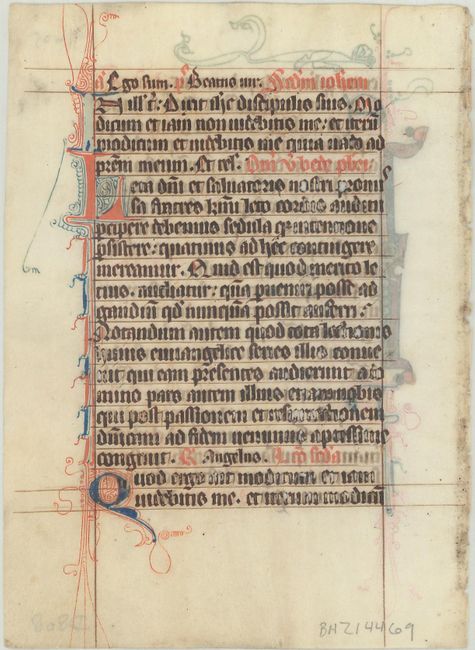 This vellum leaf is from an early Breviary written in northern France or Flanders. The text is written in a single column (21 lines) in a clear Gothic book hand in black and red ink. There are four large initials in red and blue ink, with a decorative border extending into the margins.