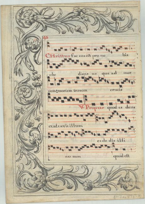 This unusual vellum leaf is from a French antiphonal. It was produced during the transitional period when both manuscript and printing methods were employed. In this example the surrounding decorative border is printed and the music is written by hand in black and red ink. The pin pricks used to rule the vellum are strongly in evidence. Beginning with the red "O" on recto at top is part of "O Vos Omnes," a responsory that is often part of Roman Catholic liturgies for Holy Week. The verse translates as: