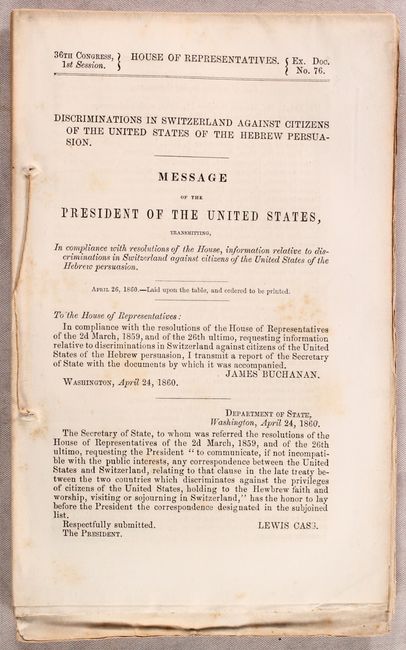 This 101 page report contains documents relating to Swiss discrimination against American Jews. In 1850, the U.S. and Switzerland began negotiating a treaty in which the Swiss sought a provision specifying that Christians alone were entitled to the privileges guaranteed under the treaty. Protests by American Jews erupted in the U.S., and the treaty was not approved by the Senate. In 1855 a modified version of the provision became part of the treaty that was approved, though it still permitted the individual Swiss cantons to discriminate. Subsequent public protests in America were triggered by the expulsion of A.H. Gootman, an American Jew, from the canton in which he had resided for five years. Theodore S. Fay, the U.S. Minister, actively protested the expulsion which was reversed as a favor but not a recognition of a right. Fay pursued the issue and wrote extensively on the topic. His lengthy “Israelite Note” to the Swiss Council is included here. It was not until 1874 that full civil rights were guaranteed to all Jews in Switzerland. Perhaps the most lasting impact of the protests by American Jews and their organization of a convention was the emergence of a national Jewish consciousness. Disbound with pages uncut and untrimmed.