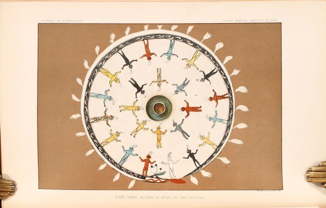 This fifth annual report features five accompanying papers in addition to the report of the director, John Wesley Powell. Of particular interest is Charles Royce's comprehensive report on the Cherokee Nation of Indians (pages 129-371) that is accompanied by two large folding maps at the rear of the volume: Map of the Former Territorial Limits of the Cherokee "Nation of" Indians Exhibiting the Boundaries of the Various Cessions of Land (31 x 28") and Map Showing the Territory Originally Assigned to the Cherokee "Nation of" Indians West of the Mississippi (30 x 20.5"). The first map shows the former territorial limits of the Cherokee Nation between the Ohio and Tennessee rivers and the Appalachian Mountains. A key lists 36 cessions from 1721 to 1835 which are numbered and colored on the map. The second map lists cessions 37-47, Treaties of May 6, 1828 and July 19, 1866. This map shows many villages, forts, and Indian agencies as well as a small section of Public Lands, Kansas, Missouri and Arkansas. The other accompanying papers include Burial Mounds in the Northern Untied States, The Mountain Chant: a Navajo Ceremony, the Seminole Indians of Florida, and Religious Life of the Zuni Child. The volume is further illustrated by 21 plates (7 in color) including four graphic Zuni plates. 564 pages. Hardbound in green cloth with gilt illustration on the front cover.