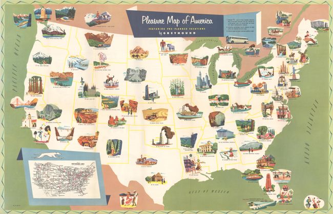 B. Pleasure Map of America, dated 1953 (27.2 x 17.5"). This attractive "pleasure map" features 45 illustrations of "the many features you may include in a Greyhound tour" including Giant Redwoods (California), Mt. Rushmore (South Dakota), and Mammoth Cave (Kentucky) to name a few. Small green dots on the map indicate where these attractions can be viewed en route and red dots indicate Greyhound travel bureaus. Includes at inset at bottom showing the complete Greyhound network. Verso contains descriptions of the 45 itineraries. Self-folding (4.0 x 9.0"). Condition: Fine. (A+)
