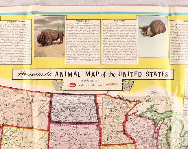 This mammoth and apparently scarce map of the United States is surrounded by 31 illustrations of animals found in the United States. Each illustration is accompanied by a detailed description and features the prairie dog, cougar, armadillo, black bear, beaver to name a few. The large U.S. map at center identifies national parks, mountain peaks, rivers, and place names. The map was prepared by Hammond for Necco - makers of the famous Sky Bar and Necco Wafers. Given the map's size, it was likely intended as a classroom instructional aid. There are no past sales records and only one institutional copy located on OCLC.