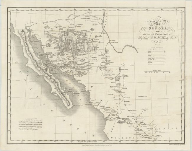 Hardy’s map provides a detailed survey and chart of the Gulf of California (Sea of Cortez) with his route depicted. He was a commissioner of the General Pearl and Coral Fishery Association of London and traveled to Mexico to study the pearl potential. The map is full of information on the little-known regions of Sonora and Lower California with emphasis on mining. It incorrectly depicts the mouths of both the Gila and Colorado Rivers at the head of the gulf. Published by Henry Colburn.
