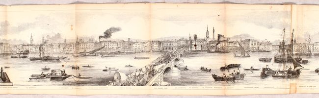This unique panoramic view of London along the Thames River measures an astounding 18 feet in length. Engraved on wood with place names at the foot, the map begins at Western Stone Wharf and Victoria Tower to the Isle of Dogs, then "We now cross the River, and the View is taken on the opposite Shore" from Greenwich Reach to the Royal Victualling Office. Composed of seven joined sheets, affixed to the original publisher's red blindstamped cloth folder stamped with gilt stamping on spine. Sold by Azulay, Thames Tunnel.