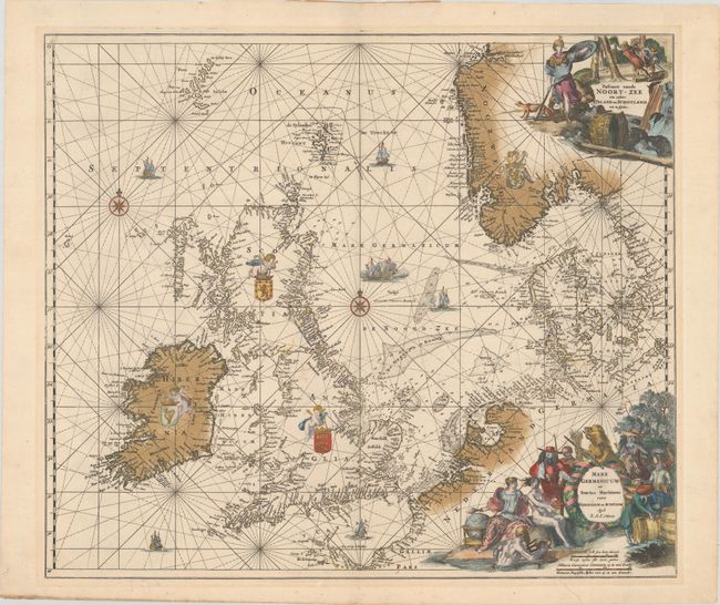 This beautiful sea chart of the North Sea includes the British Isles, the Faroe Islands, and the stretch of coastline extending from Norway south to Normandy. It includes two compass roses and is crisscrossed by rhumb lines. The seas are filled with sailing ships and a naval battle, and putti hold aloft the coats of arms of Ireland, Scotland, England, and Norway. Soundings appear throughout. There is a Dutch title cartouche at top right that features Athena with a fox and a bear and a logging scene. An additional Latin title cartouche at bottom right shows various allegorical figures including Neptune, Urania, and the States Lion with his sword and arrows. This chart was originally made and published by Frederick de Wit. The plate was acquired by the Ottens brothers after the death of De Wit's son in 1706. Following the general custom of the time, the Ottens erased the De Wit imprint, replacing it with their own.