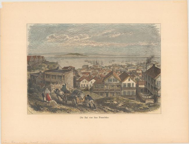 This lovely German view depicts San Francisco from the vantage of a hill. A cart passes by in the foreground with the growing city and bay in the background. Engraved by T. Weber after Hildibrand.
