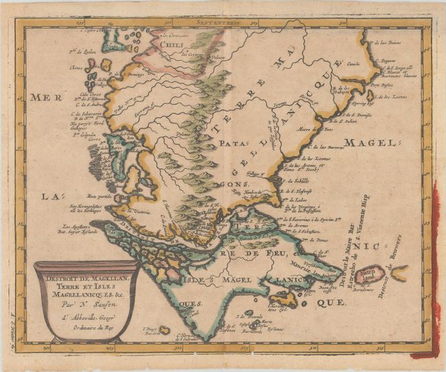 A charming small map of Tierra del Fuego showing both the Strait of Magellan and Le Maire Strait. Inland detail is confined to a mountain range and several rivers, and the mythical Destroit de Browers is labeled at far right. Adorned with a decorative title cartouche. Engraved by Antoine d'Winter.