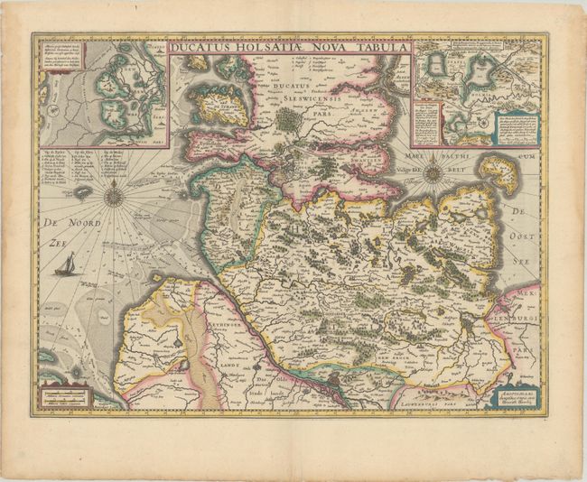 This decorative map depicts the Schwesig-Holstein region of present-day Germany, extending south to Hamburg. The inset at top left depicts the Halligen along the western coast, and the inset at right depicts several small lakes just south of Hollingstedt. The map is adorned with two compass roses and the North Sea is filled with depth soundings and a sailing ship. French text on verso.