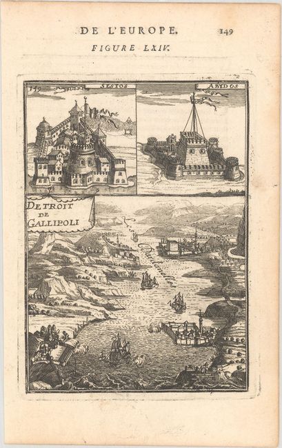 D. Sestos [on sheet with] Abidos [and] Detroit de Gallipoli, by Alain Manesson Mallet, from Description de l’Univers, circa 1683, black & white (4.2 x 5.8"). This sheet includes a nice view of the Dardanelles with several fortifications along the shores and ships sailing the strait. At top are close-up views of two fortifications: Sestos and Abydos. French text on verso describing the city of Constantinople. Condition: A dark impression on a sheet with part of a medallion watermark and light toning along the edges of the sheet. (A)