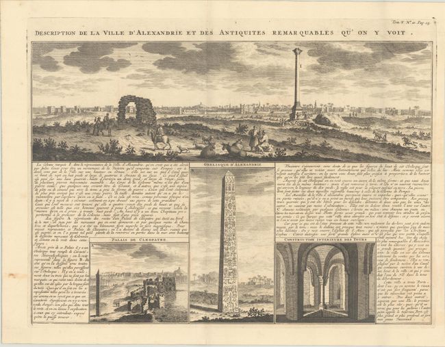 This interesting sheet contains a view of the port city of Alexandria at top with smaller views showing the ruins of Cleopatra's Palace, an obelisk, and an interior view of a tower. The views are surrounded by French text describing the city and its antiquities.
