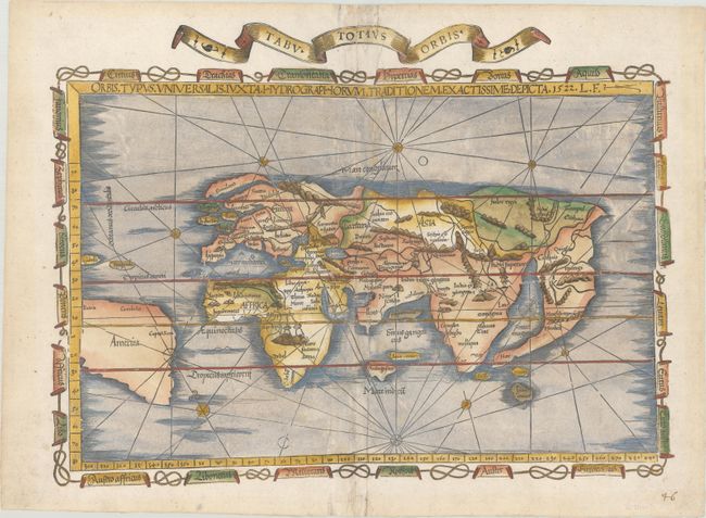 This highly desirable world map is an excellent example of the evolving (yet still warped) medieval conception of the world's geography. Fries used Waldseemuller's 1513 edition of Ptolemy's Geographia as the source for most of the maps in his own edition, but this is Fries' own work, and it is even more inaccurate than Waldseemuller's rendering of the modern world. The name America appears for the first time on a Ptolemaic map and is used to identify South America, which appears with an entirely speculative western coastline. Even relatively well-known areas of the Old World become flawed in Fries' depiction. In Europe, Scotland and England are separate islands, and India is split into a double peninsula. Despite these distortions-- or because of them-- this map is much sought after. The map is bordered by a chain of banners naming the winds. This example was published in the 1535 edition and features an additional title banner that reads "Tabu Totius Orbis." When this banner was added, the plate developed a horizontal crack running from the middle of the right side of the map.