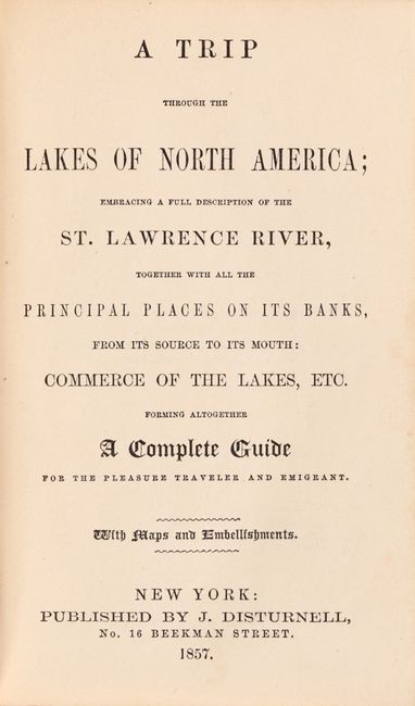 This interesting map covers the course of the St. Lawrence River and the Great Lakes region. It stretches from the mouth of the St. Lawrence west to Fort Laramie and extends as far south as Jefferson City, Missouri. The map depicts canals, railroads (both completed and unfinished), telegraph lines, stage routes, and steamboat lines. The Emigrants Route from Independence to San Francisco is delineated, as are proposed various proposed transcontinental railroads. Above the map is a profile depicting the river and lake navigation from Quebec to Fond du Lac, Lake Superior. The map is included in John Disturnell's guidebook "for the pleasure traveler and emigrant" through the St. Lawrence and Great Lakes. The book (4.3 x 6.4") describes various trips through the region and includes 12 black & white illustrations and a small map of Lake Ontario. 364 pages plus an appendix of advertisements. Hardbound in embossed brown cloth boards with gilt title on front cover and gilt title and decorations on spine.