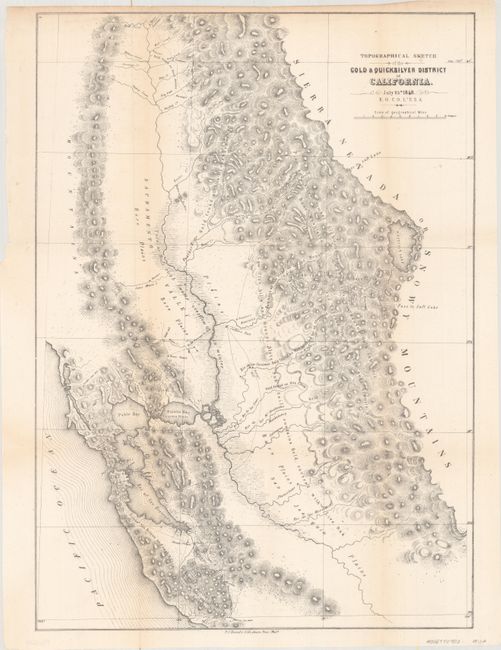 This is considered one of the most important maps of 1848. It accompanied the first official report of the gold discoveries and was the first map to reflect actual conditions at the mines, thus being of paramount importance to the California Gold Rush. It shows in detail the area south of San Francisco Bay (the Quicksilver area), across the Sacramento Valley and San Joaquin Plains and east to Lake Tahoe (here called Mountain Lake). Notes indicate where gold was to be found throughout the region. An important Gold Rush map that was lithographed by P.S. Duval of Philadelphia.