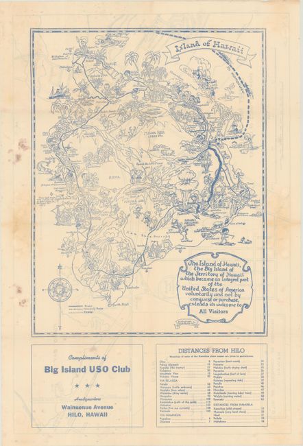 A. Island of Hawaii, circa 1944 (11.3 x 14.6"). Ruth Taylor White's charming pictorial maps are among the most popular collectible maps of the early 20th century. These whimsical maps, often known as cartographs, combine graphic style, color and comical observation and are drawn in a whimsical, humorous style much like Jo Mora's celebrated work of the same period. In this map of the "Big Island," cartoonish characters populate the island with major roads and points of interest noted, which actually makes this a fairly useful map for the tourist. Decorated by a ribbon style banner and a descriptive cartouche. This version of the map is printed in blue ink with "compliments of Big Island USO Club." The verso contains a full-page Street Map of Hilo Showing Points of Interest (19.9 x 13.2") by B.D. Chilson. Only example located was at the Library of Congress. Condition: Issued folding with some light staining mostly in the blank margins.