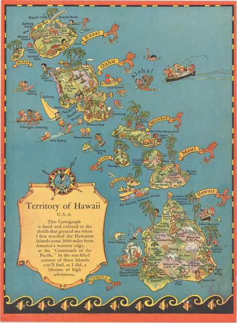 B. Territory of Hawaii U.S.A..., circa 1940 (8.0 x 10.8"). This pictorial map covers the entire Hawaiian archipelago with tiny illustrations representative of each island. Below the title at lower left, White notes that "in the sun-filled corners of these Islands you'll find, as I did, a lifetime of high adventure." Related text on verso including 27 Hawaiian words with English translations. Condition: Light staining at lower right.