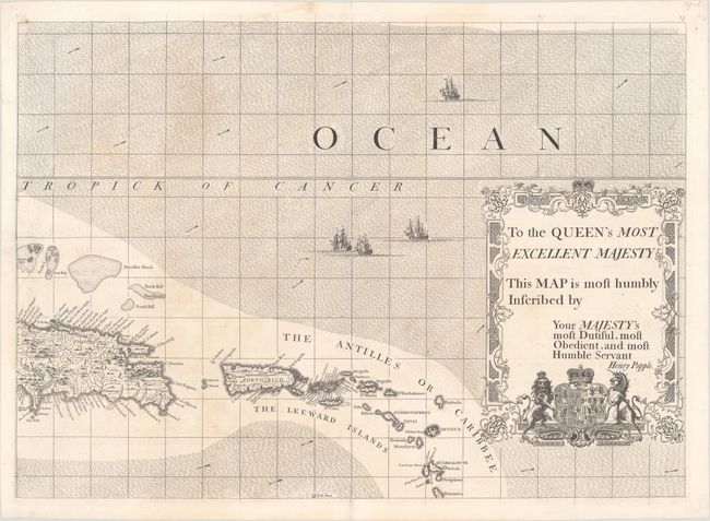 Four intricately drawn ships navigate the ocean currents of this finely engraved map. This is sheet 15 of Popple's 20-sheet map of the British Empire in North America, focusing on the eastern half of Hispaniola, Puerto Rico, and the Leeward Islands through Dominica. The map shows place names, topography, wind direction arrows, and shoals. The map is dominated by an elaborate dedication cartouche that reads "To the Queen's Most Excellent Majesty This Map is most humbly Inscribed by Your Majesty's most Dutiful, most Obedient, and most Humble Servant Henry Popple."