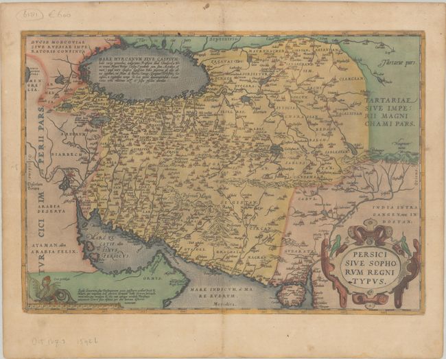 Ortelius based this fine map of the Persian Empire in part on Gastaldi's 1564 map of Asia Minor and on his own 1567 map of Asia. The map is filled with village and city names. Decorative elements include a large strap work title cartouche and a distance scale surmounted by a strange bestiary creature. Latin text on verso.