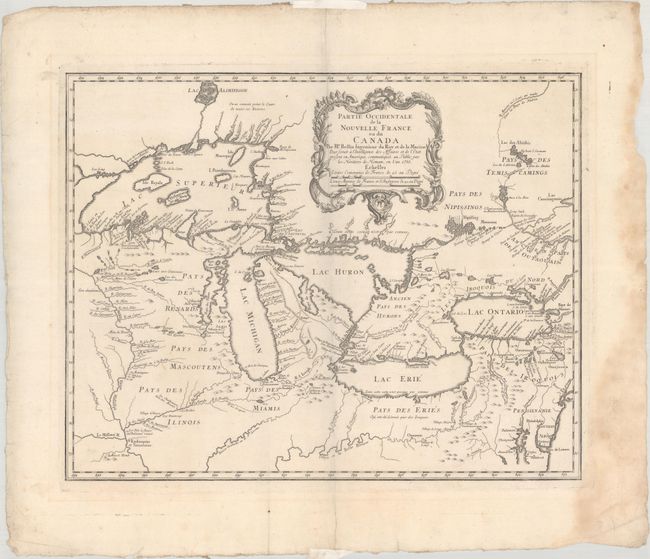 Superb map of the Great Lakes region illustrating strategic forts and the area claimed by the French just prior to the French and Indian War. Bellin's map, first published in 1744, dominated the cartography of the Great Lakes region for many years. It presented the first new material pertaining to New France since the maps of Guillaume Delisle three decades earlier. While this map summarizes the latest in French knowledge of the region, it is also notable for two cartographic myths: the mountain range in Michigan and the appearance of four fictitious islands in Lake Superior, including the infamous I Philippeaux Aut. I Minang that continued to appear on maps, and eluded explorers' searches for it, well into the 19th century. The map locates French forts, missions, new settlements, Indian villages, and includes an early appearance of Chicago, R. et Port de Checagou.. This version was published by Homann Heirs.