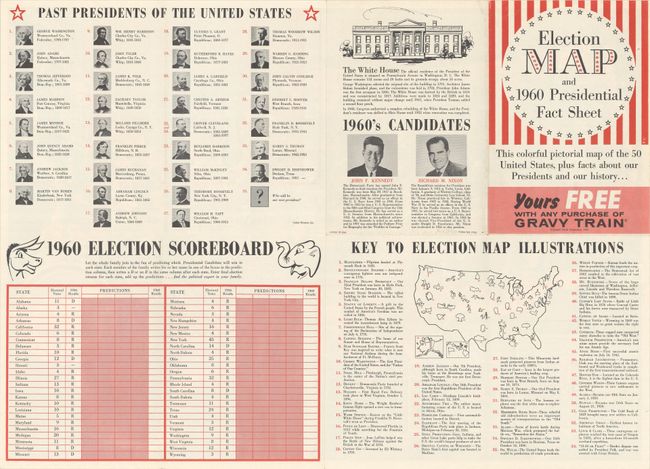 This colorful map of the United States was drawn by Lorin Thompson and published by the General Foods Corporation. The map has an unusual coloring style with symbols of American history including past presidents, Native Americans, important buildings (White House, Statue of Liberty, Alamo), agriculture, industry, and more. Includes inset maps of Hawaii and Alaska with small American flags noting they were the final two states added to the Union. The verso shows a list of past presidents, pictures of the two candidates (Kennedy and Nixon), a 1960 election scoreboard, and a key to the 54 illustrations on the map on recto. Self-folding with cover title "Election Map and 1960 Presidential Fact Sheet...Yours Free with Any Purchase of Gravy Train."