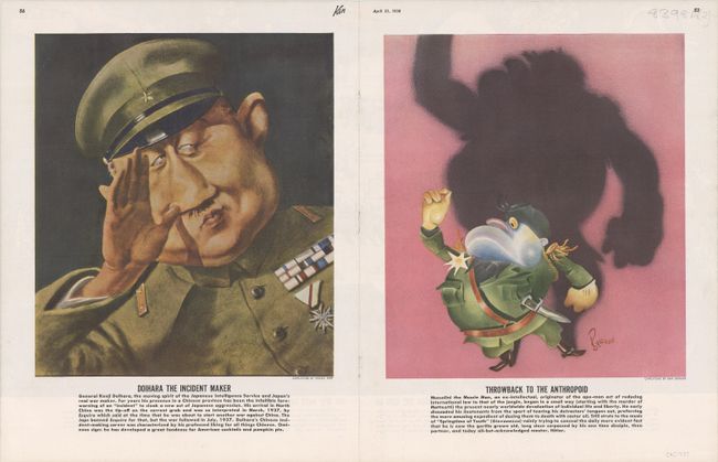 This satirical map denounces the infiltration of the Axis powers in South America just prior to the outbreak of WWII. Images of German, Italian and Japanese salesmen and military forces appear throughout the continent. Looming in the skies above are forceful winds created by "Adolf the Enforcer, Benito the Black Bomber and 'Gentleman' Hirota, the Yellow Kid," as described in the text below the map. Images of violence abound, with a citizen in Venezuela "saved from communism" by being gutted with a bayonet, and Rafael Trujillo stabbing a woman in the Dominican Republic to "make room for German settlers." Goods manufactured in Germany, Italy and Japan arrive in cargo ships. Drawn by John Groth and published in the second issue of Ken Magazine (21 April 1938), a controversial anti-fascist magazine. On verso are satirical cartoons of Japanese General Kenji Doihara and Benito Mussolini.