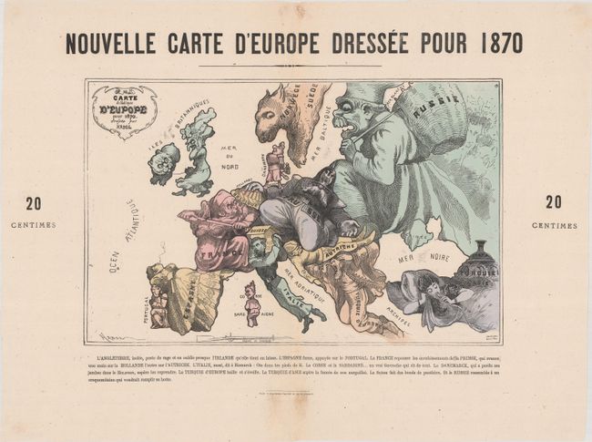 This rare satirical map was created by Paul Hadol, a French illustrator and caricaturist, at the outset of the Franco-Prussian War. Various countries and regions are represented by human and animal caricatures with props to help illustrate the situation. French text below the map describes each country's "character." Published in Paris by Vallee. The original price of 20 centimes is indicated at either side of the map.