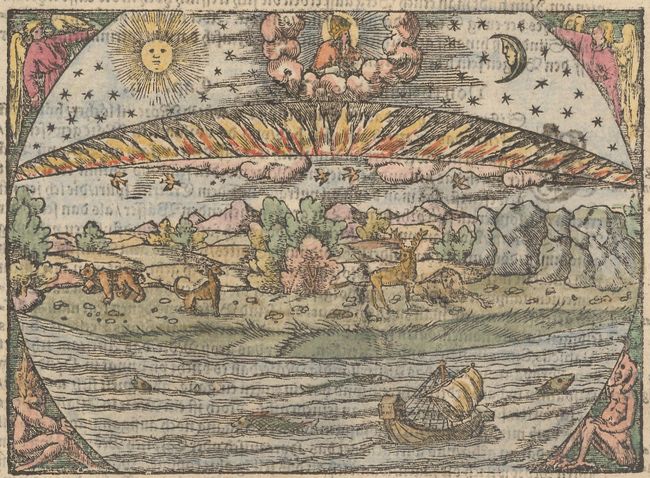 This title page contains an interesting woodblock engraving showing God's creation of the heavens and the earth. The quaint view is supported by angels at top and demons in the lower corners. On a full sheet of German text measuring 7.8 x 12.7".