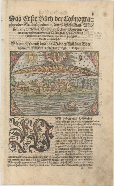 Sebastian Munster (1489 - 1552) was one of the three most renowned cartographers of the sixteenth century, along with Mercator and Ortelius. Munster's Geographia and Cosmographia Universalis were two of the most widely read and influential books of the period. His editions of Ptolemy's Geographia, published between 1540 and 1552, were illustrated with 48 woodcut maps, the standard 27 Ptolemaic maps supplemented by 21 new maps. These new maps included a separate map of each of the known continents and marked the development of regional cartography in Central Europe. The antique geography was a prelude to Munster's major work, the Cosmographia, which was published in nearly 30 editions in six languages between 1544 and 1578 and then was revised and reissued by Sebastian Petri from 1588 to 1628. The Cosmographia was a geographical as well as historical and ethnographic description of the world. It contained the maps from the Geographia plus additional regional maps and city views with nearly 500 illustrations which made it one of the most popular pictorial encyclopedias of the sixteen century.