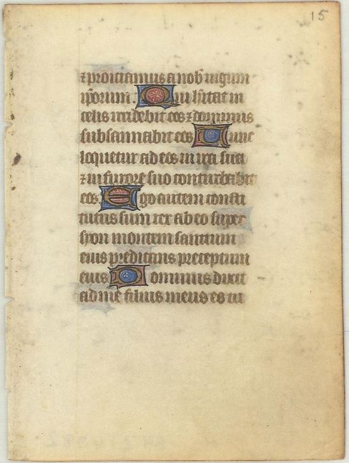 This is a lovely, tiny leaf from a Book of Hours created in France in the region between Tours and Rouen around 1430. The book was so small, it must have been the property of a lady who carried it in her purse. The are a number of initials in blue, red and burnished gold leaf, with the text is in dark brown ink. The text is part of Psalm 2, verses 4-11: