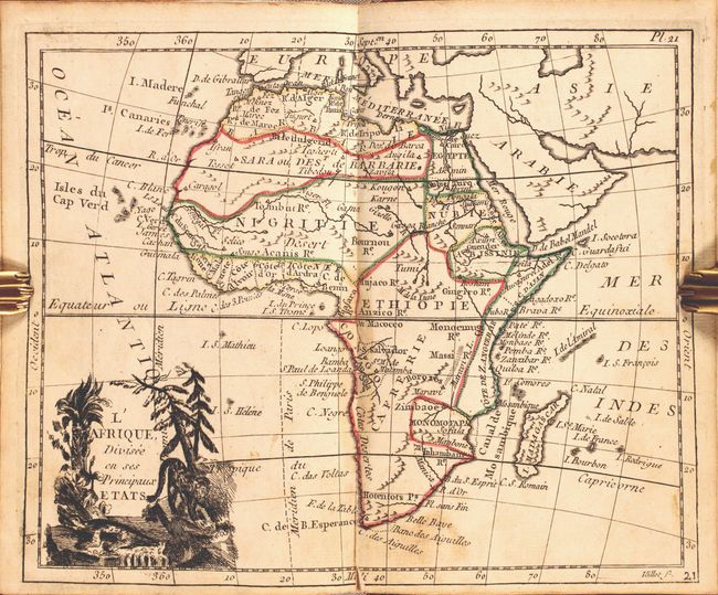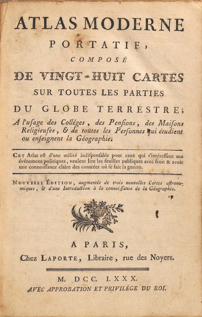 This complete atlas devotes a larger than usual number of maps to regions outside of Europe. The maps focused on the Americas include a map of North America, South America, the Gulf of Mexico, New England, Virginia and Maryland, and Jamaica. There are 28 double-page maps including a folding map of France, a lovely armillary sphere plate, and 4 unnumbered, single-page plates containing astronomical charts. The cartographer is not named on the title page, though the introduction was written by Robert de Vaugondy. This atlas is sometimes attributed to Robert de Vaugondy and sometimes to D'Anville.
