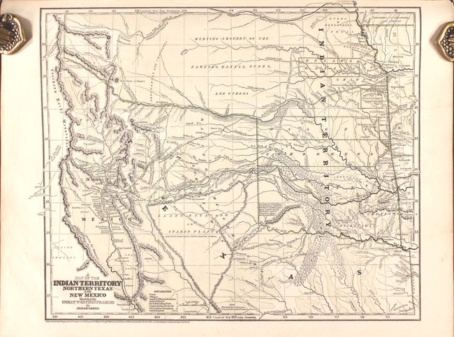 The most remarkable map is Josiah Gregg's "A Map Of The Indian Territory Northern Texas and New Mexico Showing the Great Western Prairies." Wheat describes this as a "cartographic landmark" of the western territories and covers the area from Missouri, Kansas and Louisiana to the Rocky Mountains. The map shows the northern part of the Republic of Texas reaching along the Rockies and has quite a bit of Indian Territory as well. New Mexico is shown, with Santa Fe as the destination of the route of the Santa Fe Caravans. The map has many tracks of explorers and other routes shown, with topography, towns, villages, smaller villages and ranches, Indian villages, forts, trading posts, ruins, springs, and camps. This would have been a very valuable map for anyone considering traveling across the prairie in the mid 19th century. The map was also published in Gregg's Commerce of the Prairies: or the Journal of a Santa Fe Trader.