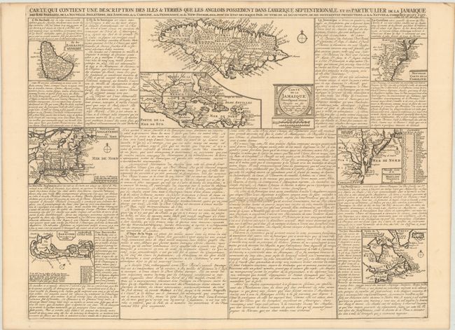 A very interesting folio sheet containing seven maps inset into panels of French text. The largest map, Carte de la Jamaique Nouvelle... (9 x 5.7"), shows the island in great detail and includes a large inset of the Gulf of Mexico and West Indies. The other maps illustrate Barbados, Bermuda, and the British colonies in North America (in four regional maps, including Chatelain's only map to exclusively focus on New England). Together these maps cover all of the regions colonized by the English at the early part of the 18th century.