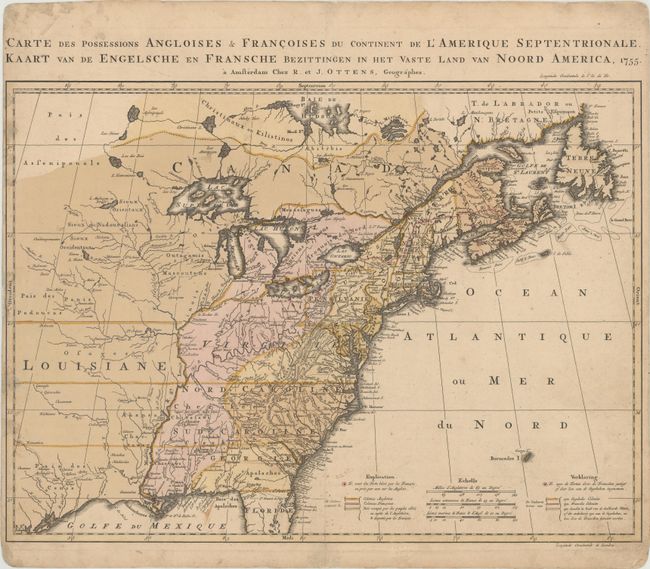 This is the Dutch version of Jean Palairet and Thomas Kitchen's important map showing the French and English territorial claims on the eve of the French and Indian War. The Palairet/Kitchen map was in turn based on John Mitchell's index of his large, epic map of the region. The map is filled with meticulously engraved detail of towns, forts, roads, and tribal lands. Beautiful original color delineates the French and British colonies and those lands in dispute between the two powers. The French forts are noted with a tiny, red circle around them. The Great Lakes are beautifully illustrated with Lake Superior still sporting the imaginary island of Philippeaux. Title and notations are in both French and Dutch.