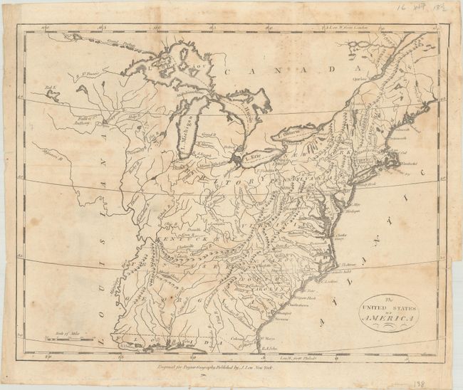 This map of the young United States covers the region from Maine south to Florida and west to the Mississippi River. Georgia's western boundary extends to include present-day Alabama and Mississippi. A large N.W. Territory stretches from Minnesota to Ohio. Several spurious islands are located in Lake Superior including I. Royal. Vermont is not named. Inland detail is limited to rivers, topography and some place names. This map was published in the American edition of Payne's Geography, printed and sold by John Low in New York.