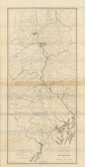 This pair of early maps reflects the federal government's early concern for providing a viable transportation system across the country. The detailed and interesting maps were based on a map by Col. Stephen H. Long, compiled by F. Harrison, Jr., drawn by A.J. Stansbury, and engraved on copper by W. Harrison. The first sheet covers an 80-mile section from just below Washington D.C. to Athens, PA, on a scale of five miles to the inch. The various routes run through Harrisburg, Williamsport, Baltimore and Lancaster. The second map is untitled and shows the road system north of the Susquehanna River to Lake Ontario. Both are filled with great detail of country roads, turnpikes, towns and even locates taverns and stores. Each is printed on two joined sheets. Size given is for the first map, the second untitled map measures 16.6 x 28.4".