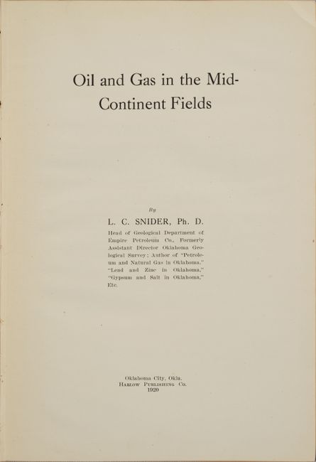 This comprehensive volume was written by L.C. Snider, Head of the Geological Department of Empire Petroleum and a former Assistant Director of the Oklahoma Geological Survey. The 393 pages of text "is an attempt to put in concise form the essential information concerning the Mid-Continent oil and gas fields," and includes detailed descriptions of the oil fields' history, geology, reserves and valuations. Included in the rear pocket of the volume are the following three maps: