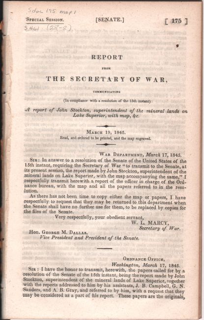 This map prominently depicts the Trap Range on the Upper Peninsula of Michigan. This copper-rich region was ceded by the Chippewa Indians per the Treaty of La Point, and a mining boom followed. A note at bottom states that it was compiled "partly from explorations made in 1844 by the Mineral Land Agency at Copper Harbor, under instructions from Hon W. Wilkins, Secretary of War." The map also locates Methodist missions, Catholic missions, and the American Fur company. Accompanied by the disbound 22-page report along with two other documents. Housed in archival paper covers with handwritten label.