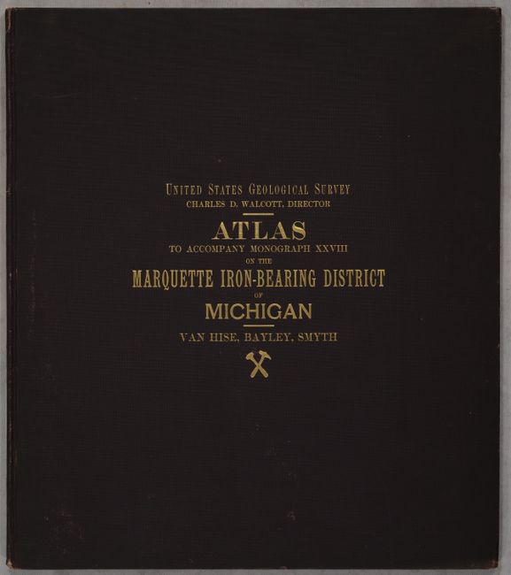 This elephant folio atlas contains 36 geologic maps and was issued in conjunction with the 746-page monograph "The Marquette Iron-Bearing District of Michigan." The lengthy report (not included) was the first systematic attempt to examine the geological structure of the iron-rich Upper Peninsula of Michigan, covering a 35 mile stretch from Marquette to Lake Michigamme. The atlas consists of a large index map and 35 detailed sheets, each displaying the geology in vivid color including iron, granite, slate, and quartzite to name a few. Each sheet is accompanied by a geological section and legend at bottom. Hardbound in brown cloth with gilt title on the front cover.